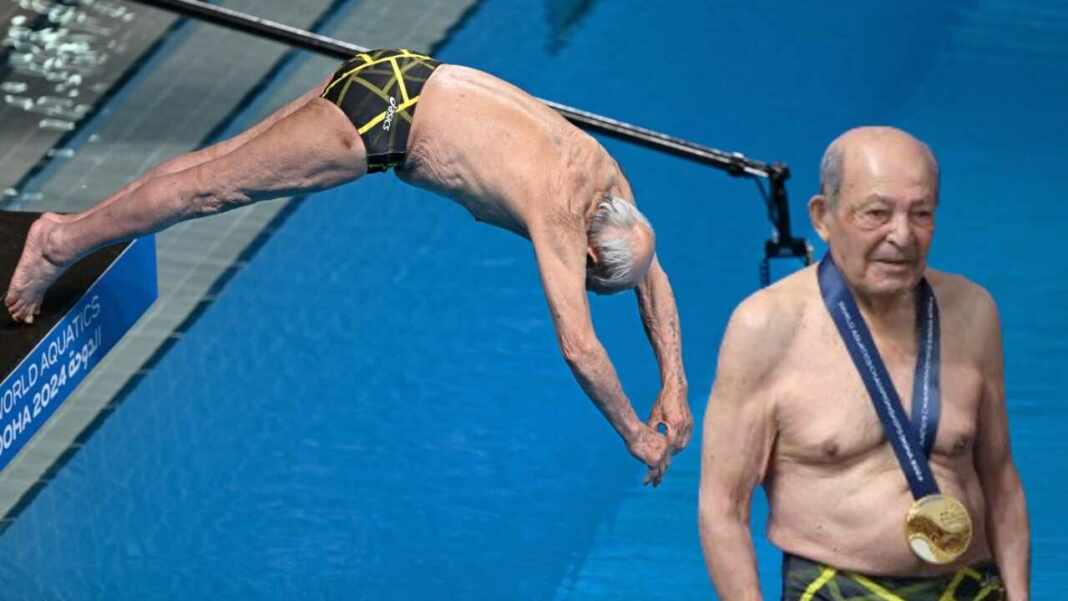 En medio del campeonato Mundial de Natación celebrado en Doha, Catar, un hombre clavadista de 100 años de Irán identificado como Taghi Askari logró ganar una medalla de oro.